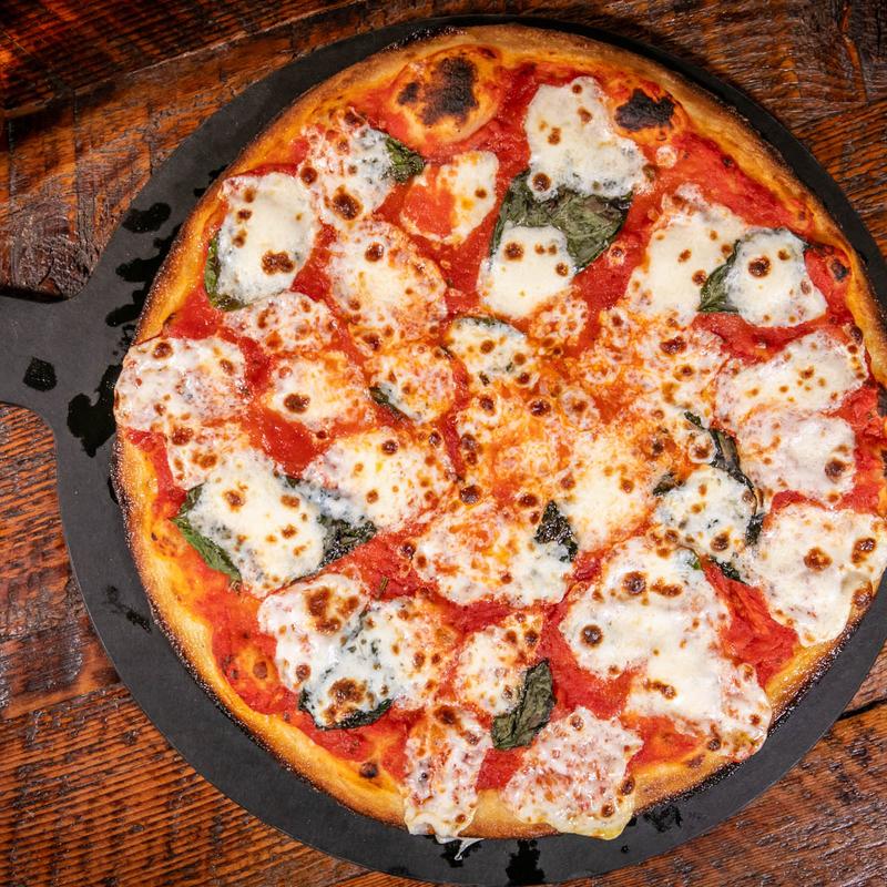San Marzano base, extra virgin olive oil, fresh mozzarella, and basil.
