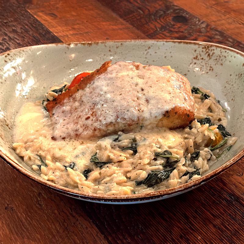 Herb-crusted seared salmon, creamy tomato and spinach orzo, and a beurre blanc sauce.