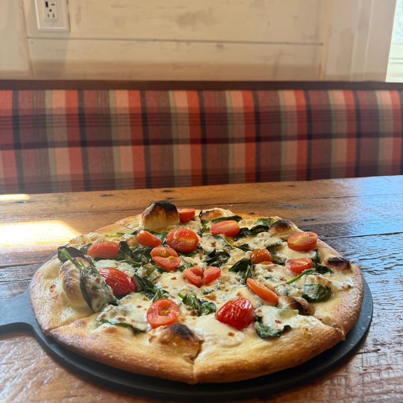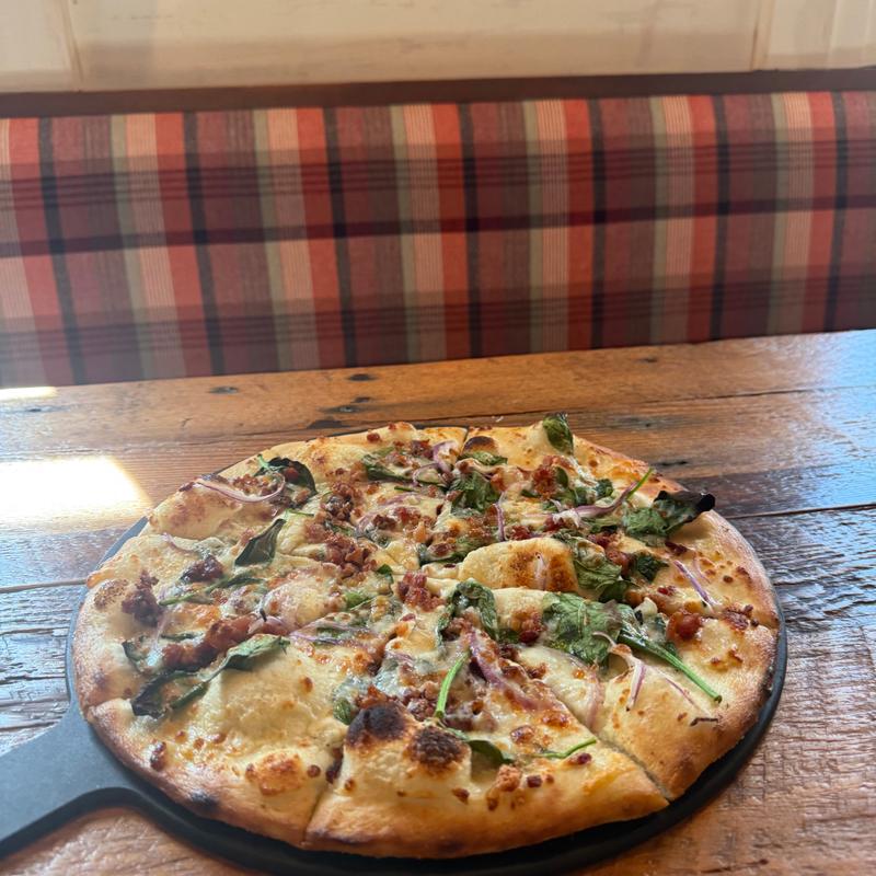 Garlic-ricotta base, spinach, red onion, bacon, house cheese blend, and blue cheese crumbles.
