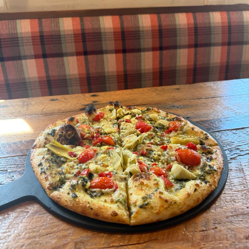 Pesto base, fresh tomatoes, artichokes, caramelized onions, roasted red peppers, goat cheese, and house cheese blend.